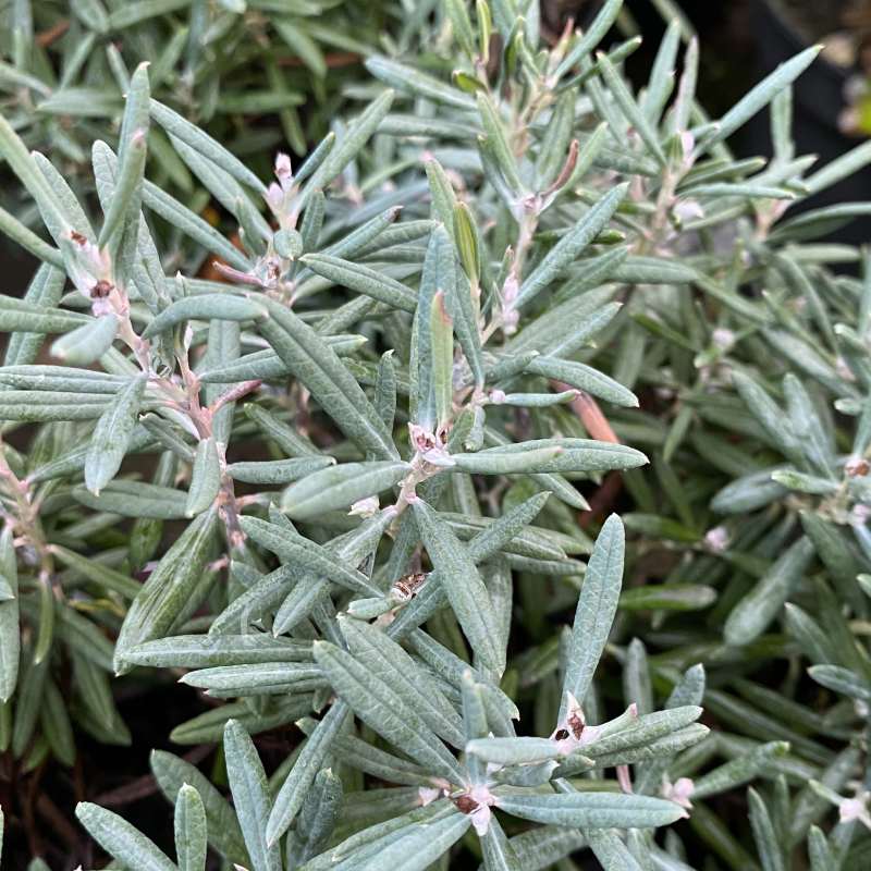 Andromeda polifolia Blue Ice. Bog rosemary. Dwarf evergreen shrub with blue/green narrow, needle-like leaves and small pink bell-shaped flowers in spring. Full sun to partial shade, moist but well-drained soil, sheltered locations.