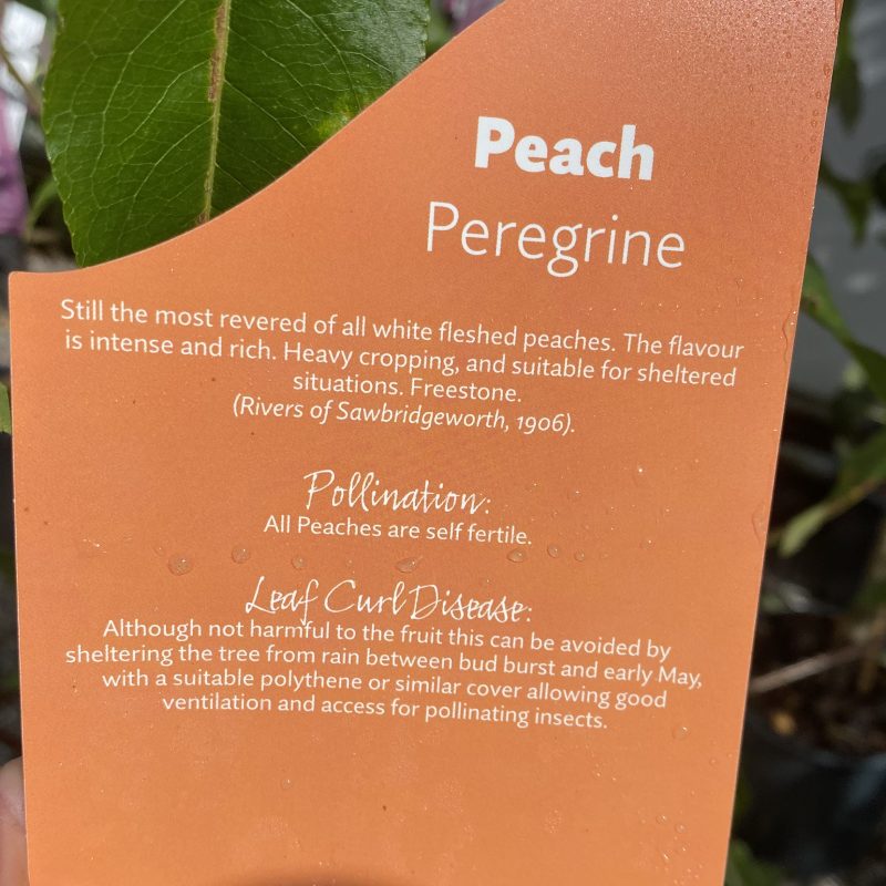 Peach Peregrine, St. Julien A rootstock. Self fertile. White fleshed fruit, with intense flavour. Heavy cropper. Full sun, partial shade, well-drained soil, sheltered location. Protect from strong winds and frost.