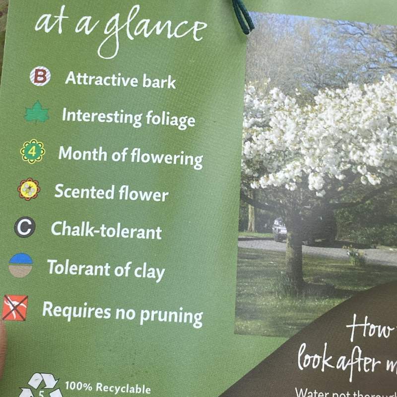 Flowering cherry Shirotae, Mount Fuji cherry. Umbrella-like small tree, with horizontal branches. Large single scented white flowers in spring. Full sun, partial shade, most soil types and sheltered locations. Full height 3m+