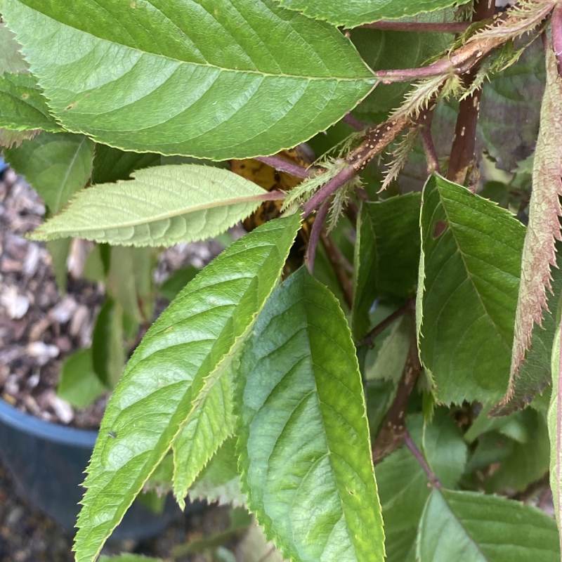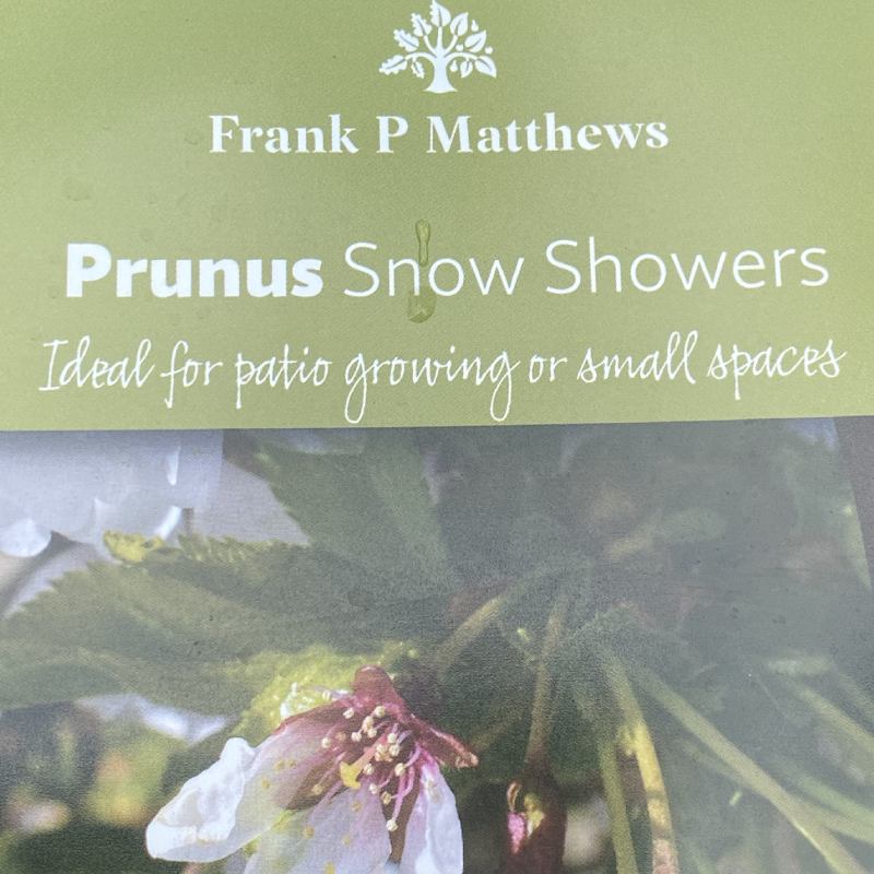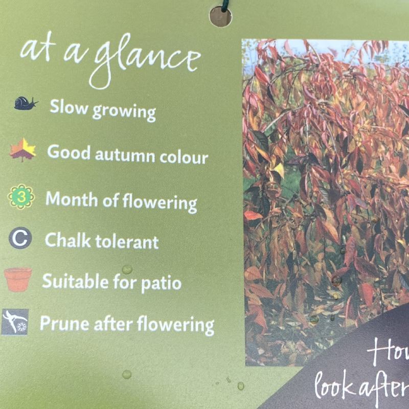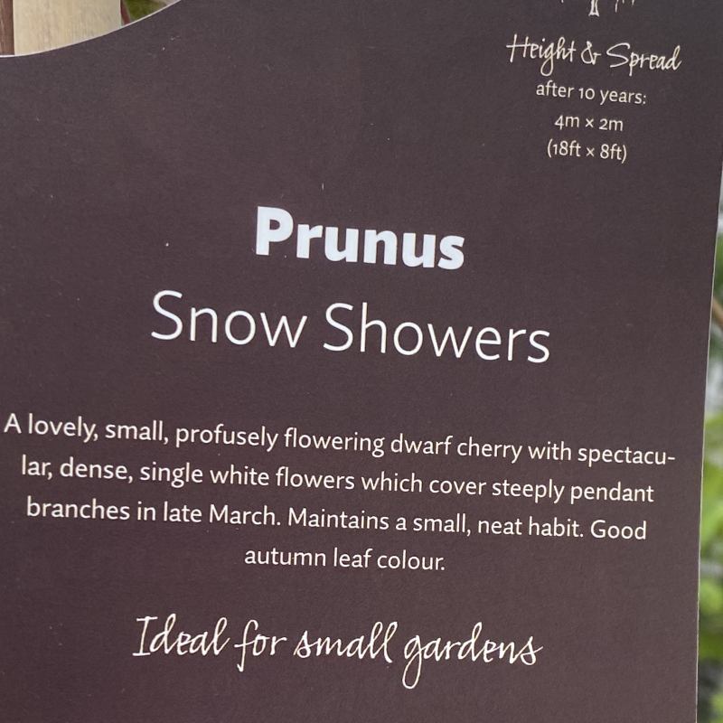 Flowering cherry Snow Showers. Dwarf, narrow, pendulous tree, prolific white flowers in early spring and good autumn colour. Full sun, partial shade, most soil types, sheltered location. 3m+ full height